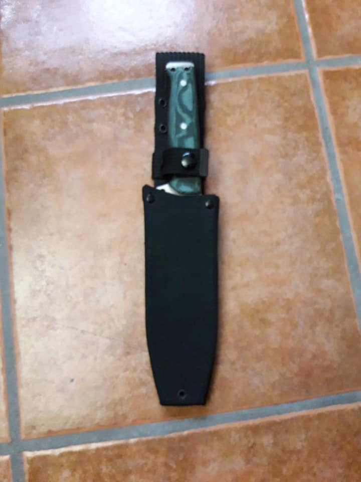 Cuchillo de monte artesanal realizado por Manuel de la Torre, acero MOVA, 16 cm de hoja enteriza, cachas de micarta verde y funda de material sintético. 110 euros envío incluido a la península.