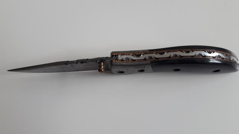 Navaja perkin con acero de Damasco , cachas de cuerno de búfalo y funda de piel. Esta en Valencia , 35€ más envio.