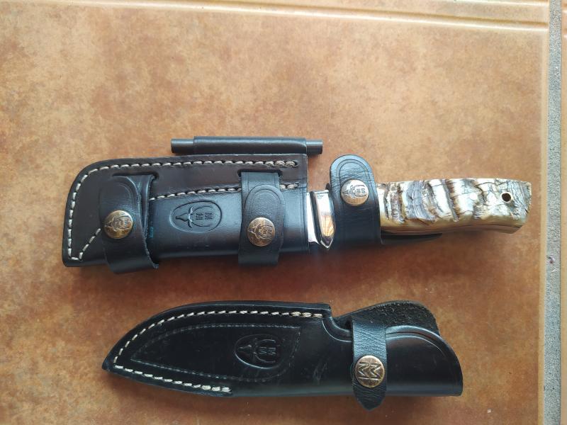 El cuchillo va con dos fundas Muela para el; una simple y la otra de porte horizontal o vertical con alojamiento de ferrocerio para hacer fuego.