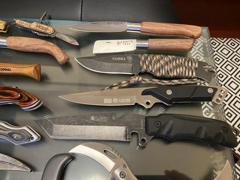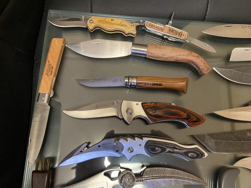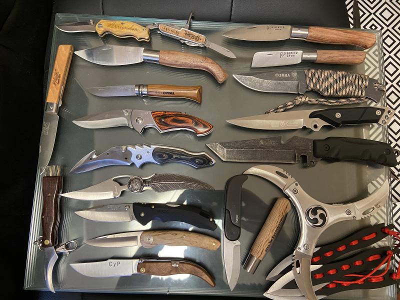 Pongo a la venta un lote de 16 navajas, 5 cuchillos y un par de artificios decorativos de 3 hojas, la mayoría sin estrenar -solo cuatro piezas con algunas marcas de uso-.