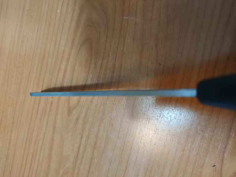 La hoja está afilada en dos ángulos diferentes. Cerca de la empuñadura, una porción de 5 cm / 2" tiene un ángulo de 25° para tallado y trabajo fino. El resto de la hoja tiene un filo de 34°, lo que ha demostrado ser excelente para este tipo de cuchillas picadoras.