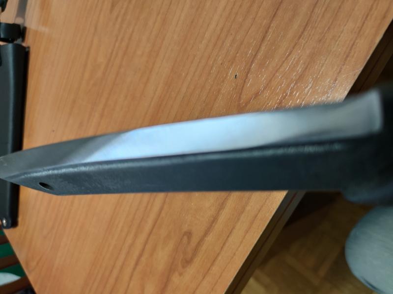 Cuando se muele la hoja, se revela el acero interior más duro, aunque la superficie exterior tiene solo 52 HRC, el borde real es 59 HRC. Esta es también la razón por la que rectificamos los biseles en los lados del lomo; de lo contrario, las esquinas del lomo no serían lo suficientemente duras como para que salten chispas de las varillas de ferro.