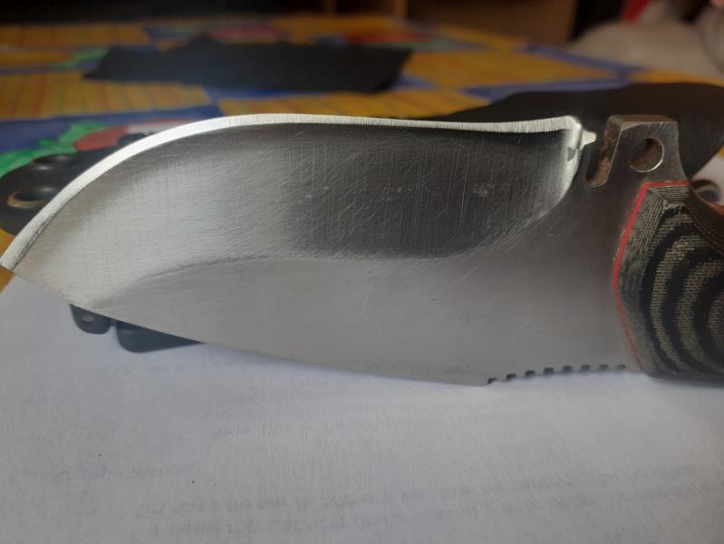 Micarta negra con separadores rojos. Aunque el cuchillo no se ha usado le repasé el filo por entretenerme con el sistema de afilado Lanski. Ahora se puede afeitar con el. Los roces que se aprecian en la hoja son de entrar y salir de la funda.