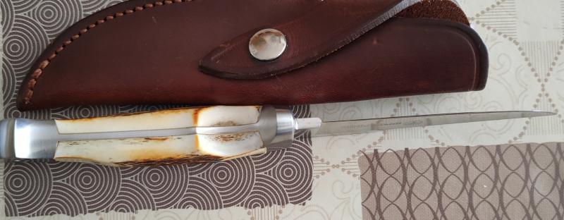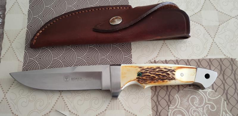 Buenas tardes me encargan que ponga de nuevo en venta este magnífico cuchillo enterizo,en acero 440C y cachas de cuerno de venado, fabricado en Solingen por Boker,funda de cuero de la misma casa.200€