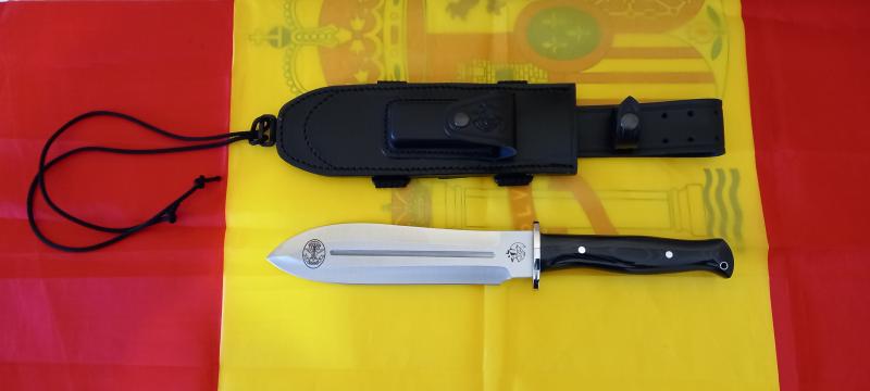 Hoja de acero Mova ( molibdeno y vanadio) enterizado gran dimensión y anchura de hoja cachas de micarta negras y funda de cuero de calidad.