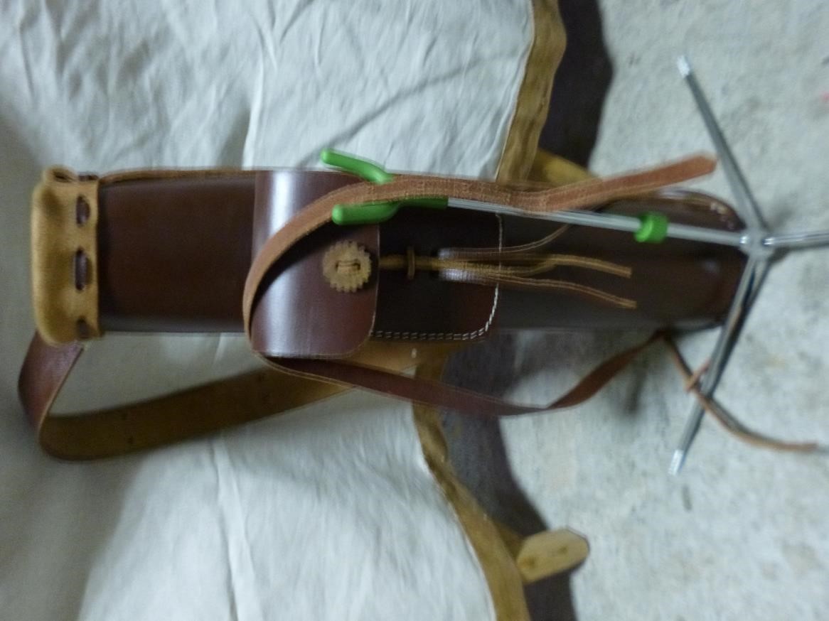 - Carcaj de espalda de cuero con cincha ajustable, con bolsillo.