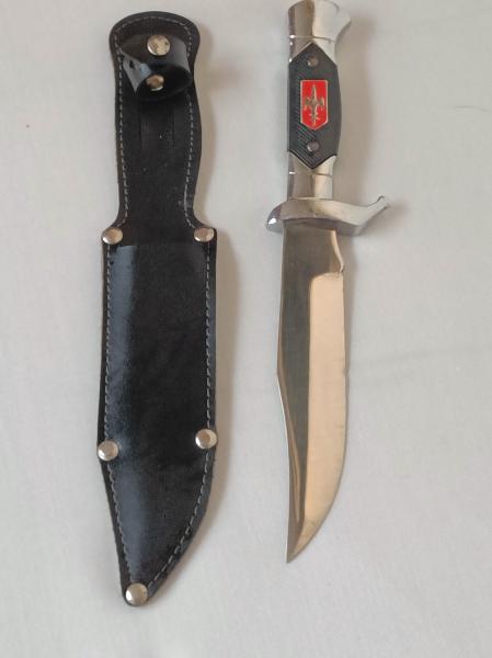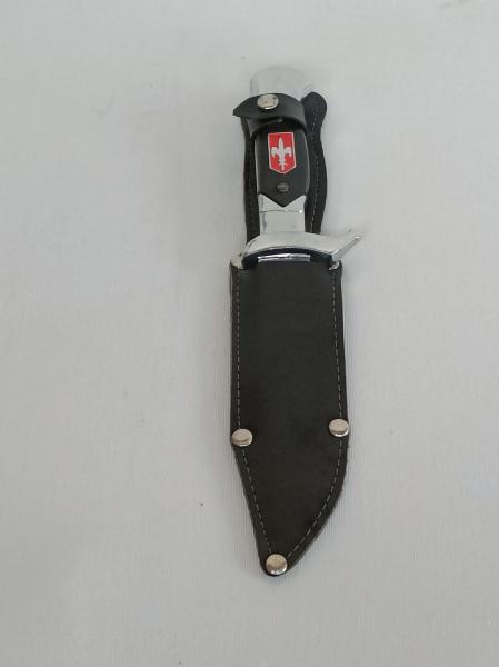 Empuñadura con cachas negras e incrustación metálica de escudo de flor de lis plateada sobre fondo de color rojo.