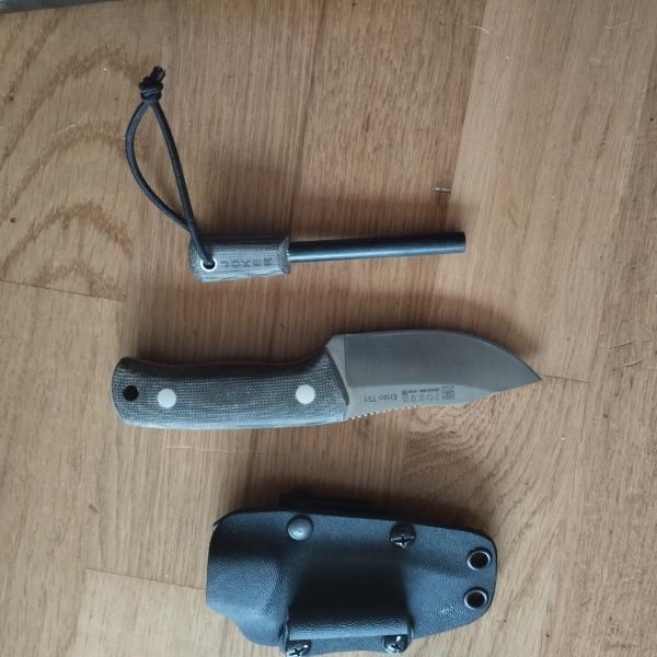 Vendo Joker Erizo TS1 con Pedernal a juego y funda de Kydex. Cachas en mikarta verd con separador rojo y el pedernal a juego en el mismo color.