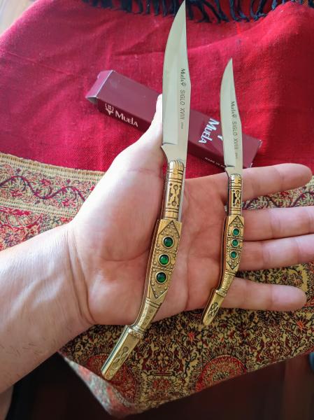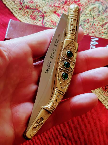 Muela modelo ML12, serie siglo XVIII, modelo Grande, longitud total, 26 cm. Latón macizo con piedras verdes, descatalogada hace años. Acero 440C