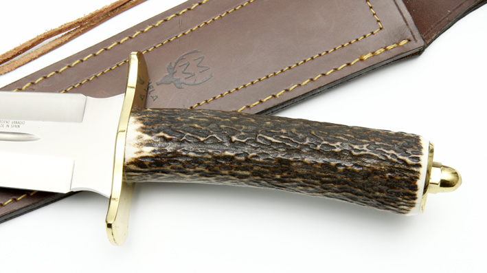 Cuchillo de caza Muela Escudero con hoja de doble filo en acero 400C, puño de asta de ciervo rematado 02