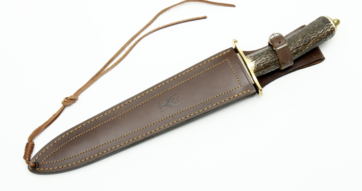 Cuchillo de caza Muela Escudero con hoja de doble filo en acero 400C, puño de asta de ciervo rematado en monterilla de latón. Cuenta con una funda de piel con cierre de hebilla y cordón de cuero en la parte inferior.