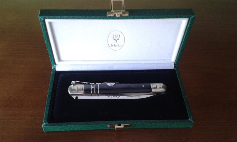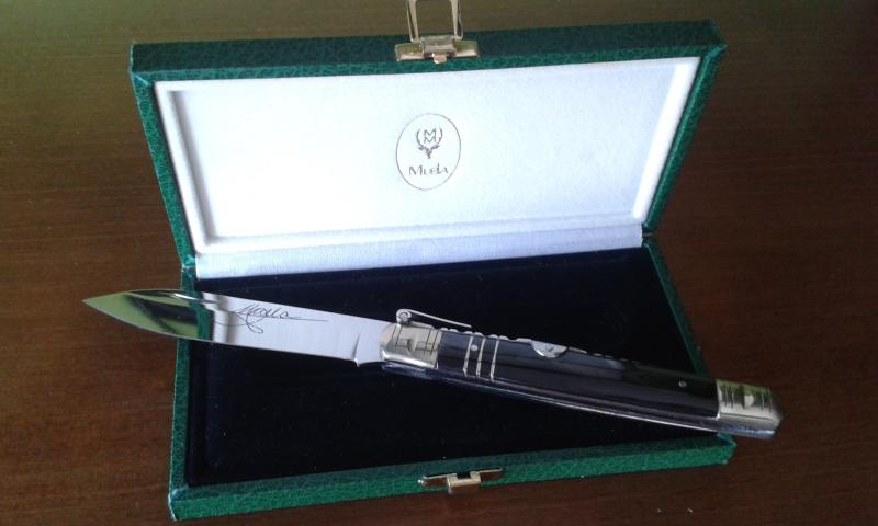 Magnifica navaja MUELA con asta de toro y alpaca, viene en su estuche original. Completamente nueva.