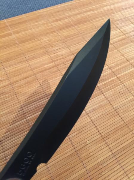 Hoja ENTERIZA de tipo bowie forjada en acero al carbono 1095 al Cromo Vanadio, pavonada en negro, de 6,5 mm. de grosor y 18 cm. de longitud. El filo literalmente afeita.