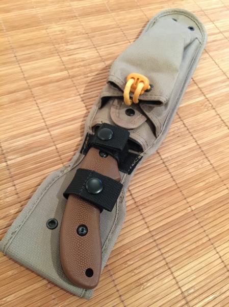 Funda táctica de gruesa cordura, con sistema M.O.L.L.E. y sujeción a cinto, con doble cierre automático más velcro para la sujeción del cuchillo KA-BAR 5600, y dos departamenteos frontales. Uno para el KA-BAR Monoblock, y el otro, de generosa capacidad, para transporte de multi-herramientas, navaja adicional, utensilios de supervivencia, o rollo de paracord.