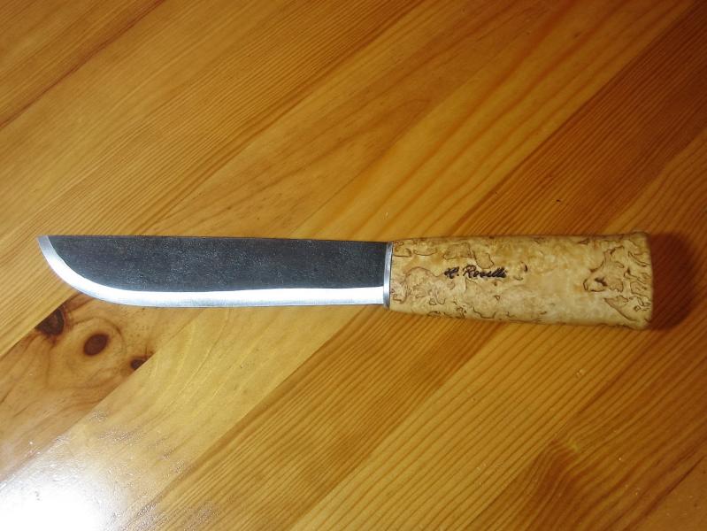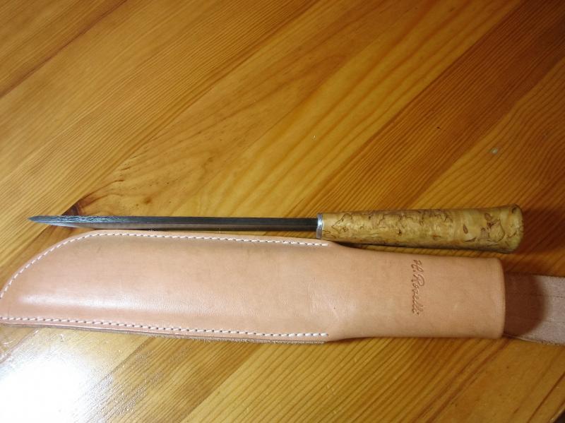 Hola. Vendo este extraordinario cuchillo Finlandés, Acero al carbono, 195mm de hoja, 6mm de espesor y de 320mm de longitud total, sin estrenar, mango de abedul rizado y funda de cuero. 70€ . Está en Asturias