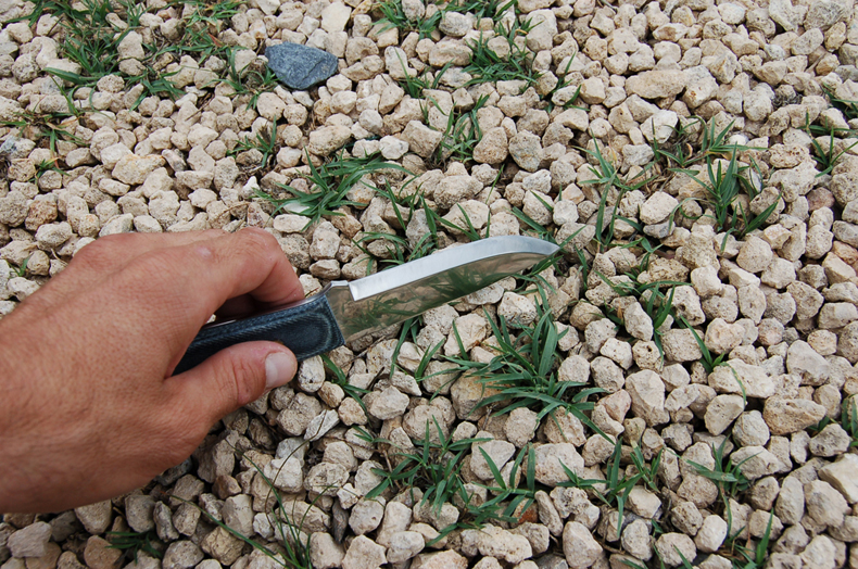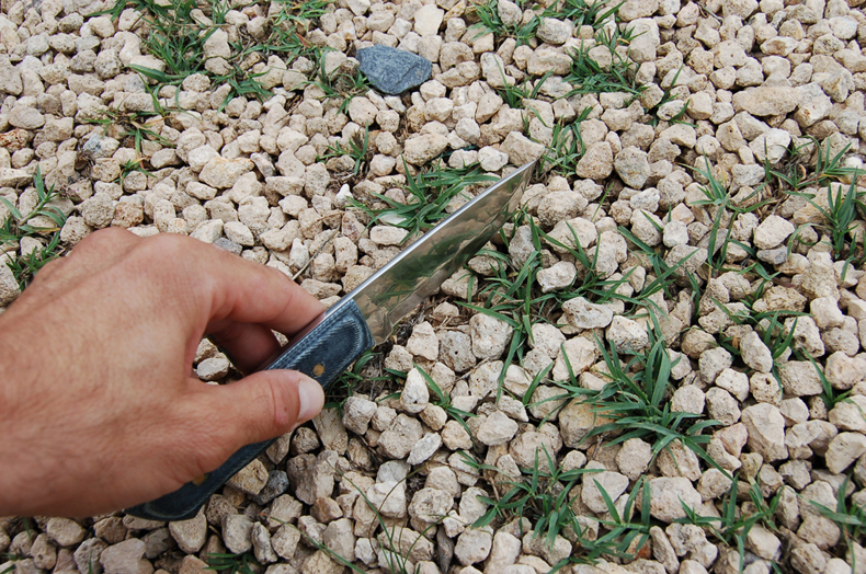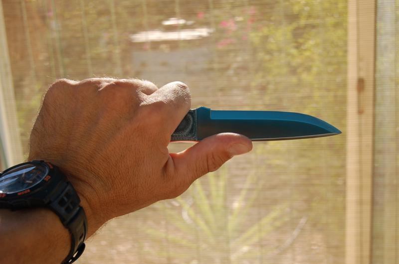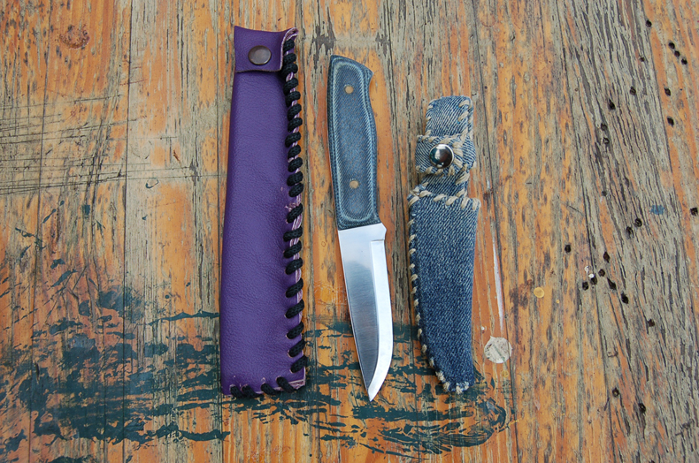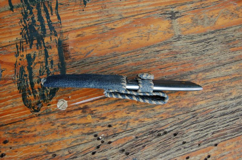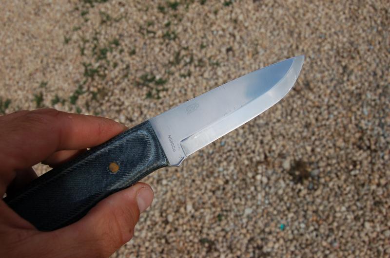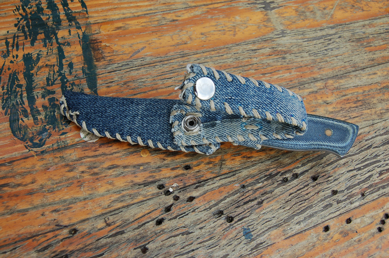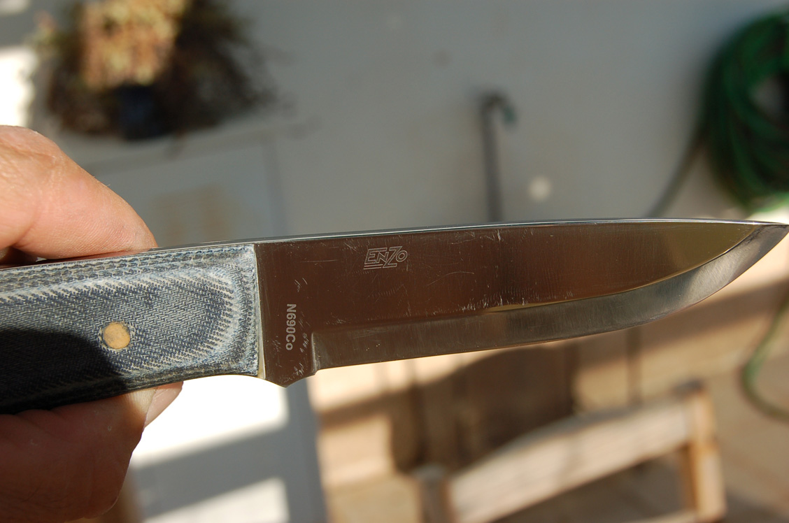 - Enzo Trapper N690Co scandi. Está usado, aunque reafilado y pulido (es duro de pulir el puñetero), pero aún se ven los marcajes en la hoja con el logo de Enzo y el tipo de acero. Le hice una funda de cuero forrada de tela vaquera y unas cachas finas de micarta vaquera hecha por mí. En ambos casos, los acabados no son "Pro". La funda permite ponerla o quitarla del cinto sin quitarse este, mediante una pollera (cierre de presión). Las cachas son muy finas porque lo llevaba en una funda tipo sobre (la púrpura que se ve en las fotos: muy de circunstancia y cutre, puramente funcional) en un bolsillo lateral de mi bolsa. Tiene no obstante, muy buen agarre. Al sujetarse elevada, portándolo con un pantalón vaquero no se ve prácticamente.