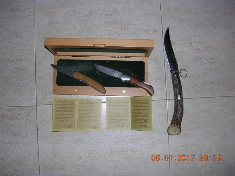 Mira la que está fuera de la caja en ciervo en una MONJIN, completamente fabricada a mano, cuesta casi 800 euros las de la caja son dos FOX Oreste Frati de 512 capas de acero de damasco martilladas a mano, la de la derecha cuesta sobre 700 euros, la otra algo más de 300, ¿a cuanto sale el centímetro de filo?, tengo más piezas de similar valor, algún día, cuando tenga ganas y tiempo las pondré.