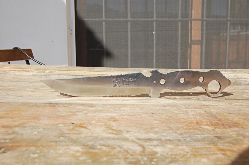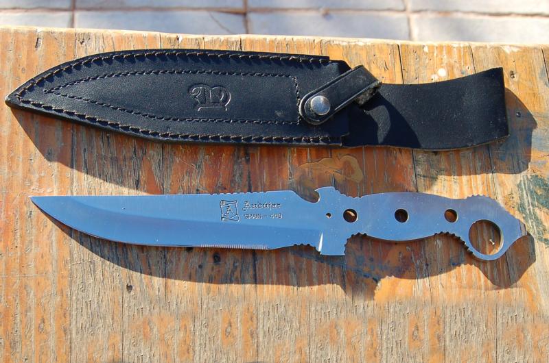 Cuchillo Andújar en acero 440. Diseño de un militar, no recuerdo cuál. Es tamaño Ka-Bar (17cm de hoja). Lleva destornillador en el pomo, a modo de percutor y abrebotellas en el lomo. Va reafilado y pulido, aunque no se usó. Funda de cuero original. 25 euros.