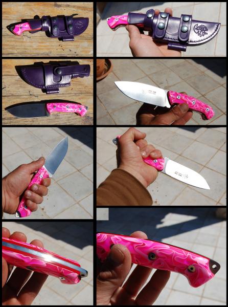 Hola. Vendo este cuchillo de J&V. El ya conocido modelo Axarquia con vaciado plano, pero en edición especial con cachas de metacrilato rosa y separadores rojos; funda multiposición de color violeta con alojamiento para ferrocerio (incluyo ferrocerio aunque no aparezca en las fotos).