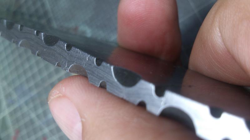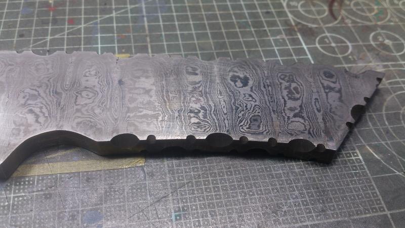 No te puedes fiar. El color negro lo da la oxidacion de un material (puede ser acero o hierro) y el color "acero" se da por un acero (este si) que tiene menos contenido en carbono que el otro material, con lo que aguanta la oxidacion mejor (se oxida menos o nada) al ser sumergido el cuchillo en un acido debil. Una manera de averiguar si son o no acero los dos materiales y la calidad del mismo es por su dureza con un medidor. A partir de 57-58 HRC ya tienes un buen cuchillo. Hay que medir tanto en el patron oscuro como en el claro, porque no van a tener la misma dureza al ser materiales distintos.