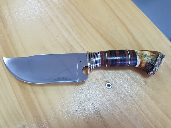cabo con latón, aluminio, fibra vulcanizada, cuero y roseta de ciervo.Espiga con pasador de latón