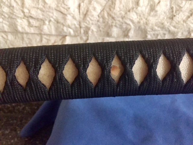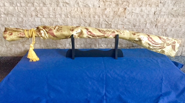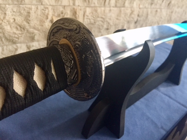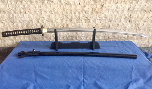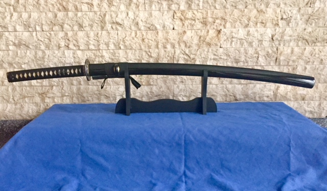 Katana totalmente funcional. Acero 1060 al carbono. Hoja pulida y afilada. Tsuba de hierro y tsuka de seda envuelta en autentica piel de raya. Saya de madera tintada en negro. Funda de seda y expositor de madera. Precio 150€