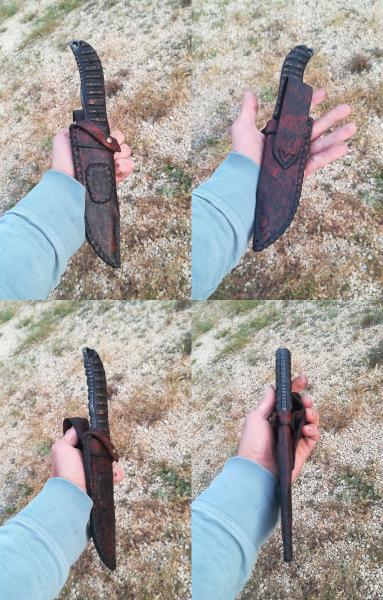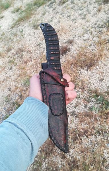 Schrade customizado. Acero 1095, 6mm de grosor, texturizado, cachas de madera, funda de cuero (envío también la original sintética). 80 euros envío a domicilio incluido. Es éste: