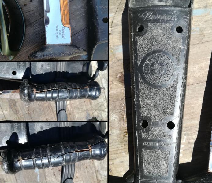 -Nemrod. Cuchillo de buceo muy gastado. La hoja es lo que mejor se conserva. Sierra en el lomo, punta plana. Cabo con el plástico rajado y funda con retenedor roto. Tiene todo, pero en mal estado de conservación. Para nostálgicos. 15 euros envío incluido.