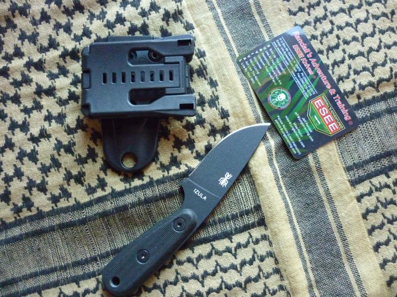El cuchillo me llego sin caja ni papeles, solo la funda y el neck sin las cachas, mas tarde yo le compre unas cachas originales en negro (27 euros) y un Tek-Lock (8 euros).