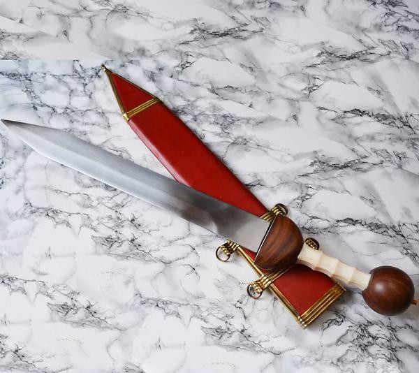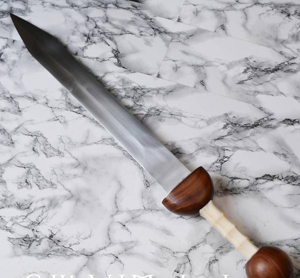 Este gladius es una réplica de un original del siglo I dC. Este gladius romano tiene una hoja tipo Pompeya (el original excavado en la ciudad histórica de Pompeya). El agarre está hecho de madera y hueso. La hoja es de acero al carbono EN45. Gladii como este se usaron hasta el siglo III dC.