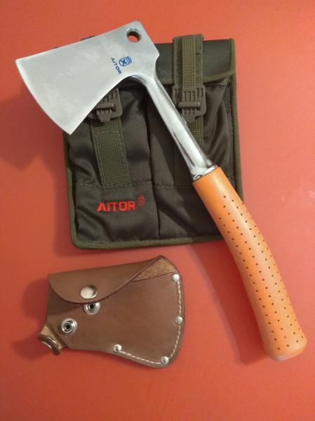 Hacha Aitor años 80, nueva a estrenar. Construcción de una sola pieza, lo que la convierte en indestructible , capuchón de cuero grueso y cierre para proteger filo y portar al cinturón.
