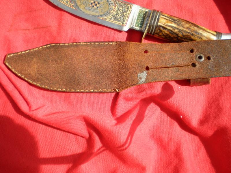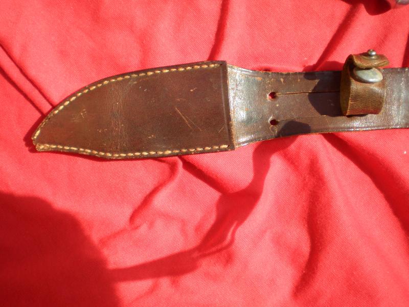 Como veréis el cuchillo es para manos pequeñas dado para quien iba destinado, tiene su patina de no limpiarlo y diría que no se a afilado ni usado jamas, la funda es de cuero tiene sus años al igual que el cuchillo, y esta descosida un pequeño trocito en la parte donde reposa la punta, algo fácil de arreglar, en fin mejor fotos para que se vea bien