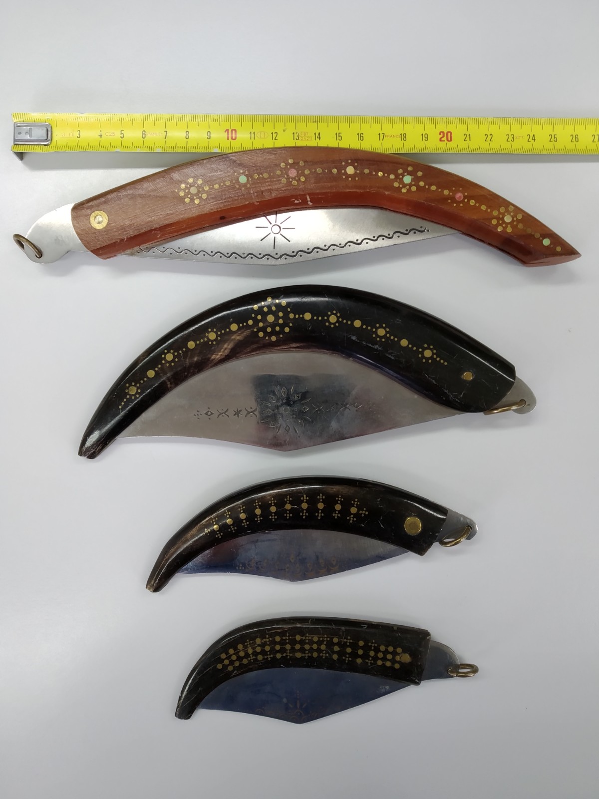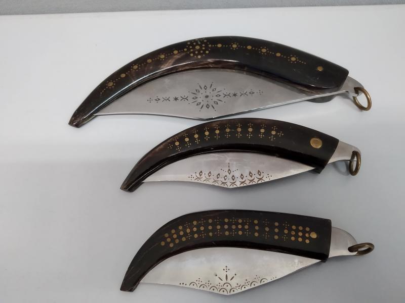 Las navajas las tengo hace más de 20 años, me las trajeron de Bulgaria y deben ser bastante antiguas, sobre todo las de cuerna. Todas tienen enserciones diferentes en las 2 cachas y grabado solo en una cara de las hojas que están bastante bien pulidas y todo impecables in golpes, ni rozaduras.