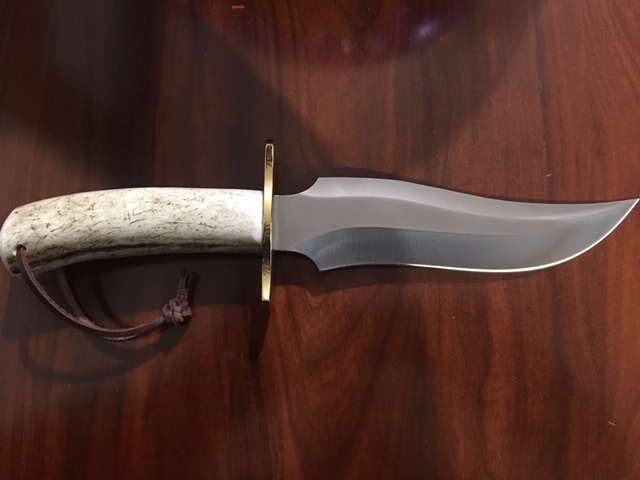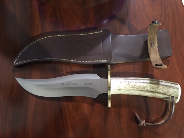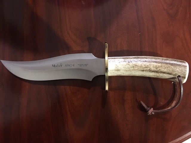 Cuchillo de monte de remate MUELA APACHE: acero X50CrMoV15 molibdeno vanadio (MOVA), dureza acero 57-58-HRC, mango de cuerno de ciervo de 12 cm, tamaño hoja 19cm, longitud total 31,5cm, peso 470gr, lleva una punta de ciervo con un cordón y virola de acero, todo una pieza hasta atrás, con su funda de piel.