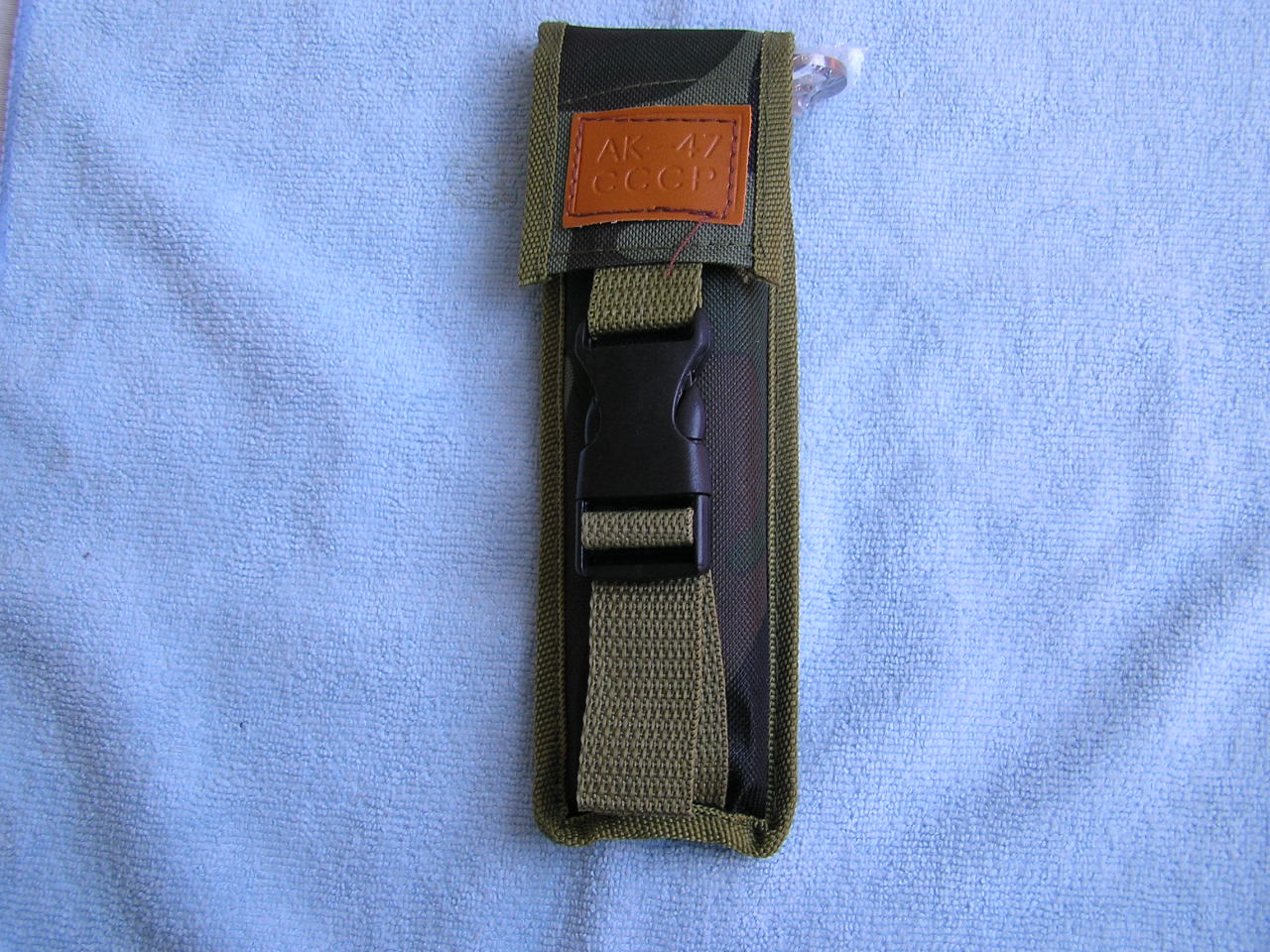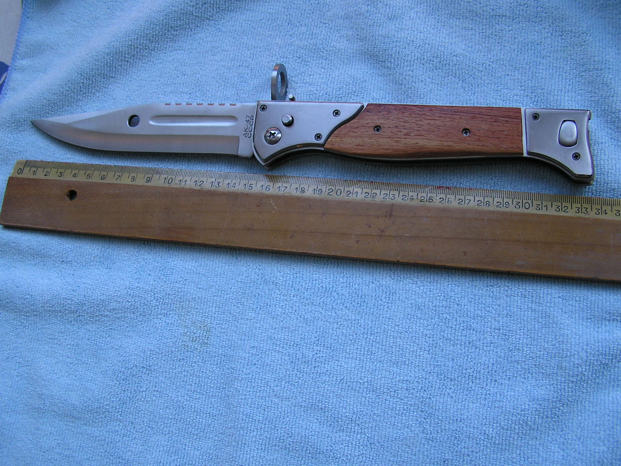 Navaja con aspecto de bayoneta del fusil AK47. Se abre automáticamente pulsando un botón después de desplazar una palanca de seguro que evita que se abra o cierre accidentalmente. Mide unos 33 cms. abierta como se ve en las fotografías. Tiene cachas de madera. Incluye una funda de camuflaje de cordura. Lleva la inscripción AK 47 CCCP en la hoja y en la funda.