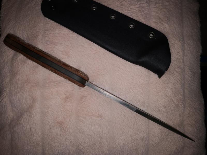Cuchillo artesanal hecho por Juan David (JD knives) realizado en acero al carbono o1 hoja de 18 cm y 6 mm de grosor mango en micarta marrón y funda de kydex separadores negros su precio 130 envío incluido