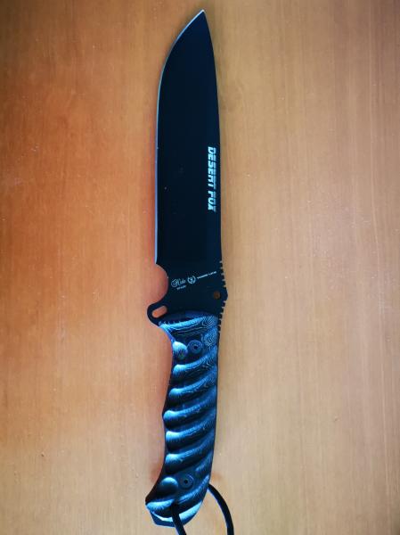 Exclusivo cuchillo Desert Fox de la casa Nieto, acero vanadio 1.4116 en negro, amolado plano, mango de mikarta negro, tamaño de hoja 19 cm, con funda de piel, solo ha salido una vez al campo por lo que tiene alguna señal de uso muy pequeña. Pido por el cuchillo 70 Euros puesto en casa.
