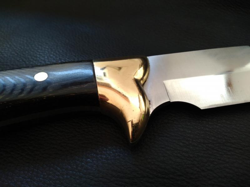 Ha tenido uso y algún afilado, pero está en buen estado, cuidado y con el filo perfecto, sin mellas. Virola de latón y empuñadura con cachas de estamina negra, impecables.