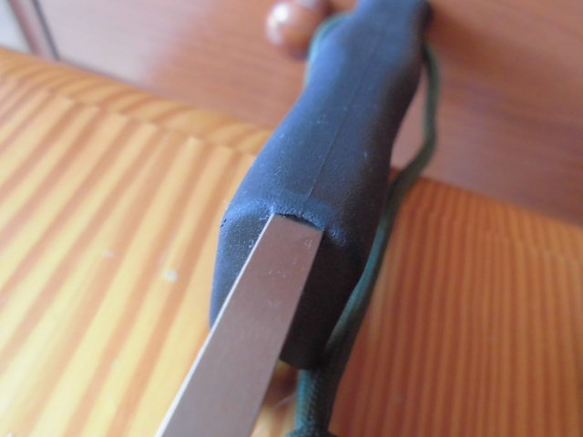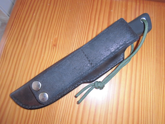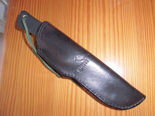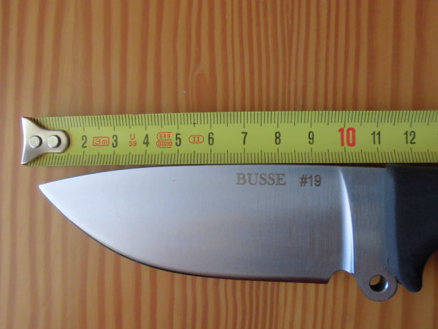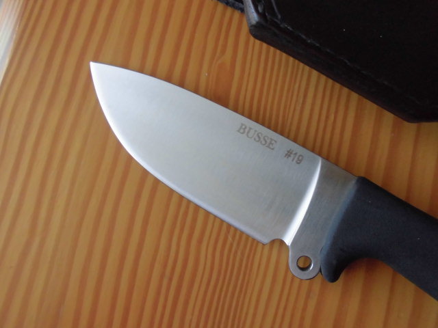 Busse Basic 4 número de serie #19, funda de cuero de Cuervo, nuevo sin uso, filo convexo. Solo destacar que en la parte de unión de la hoja y el mango en la zona del lomo el ajuste no es perfecto, ya que tiene una ligera burbuja.