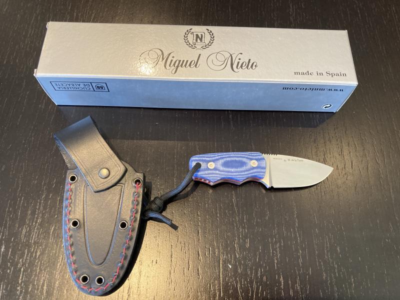 2. Nieto Chaman Micra, acero Böhler y micarta bluejean (azul). Funda de cuero negra.....45€