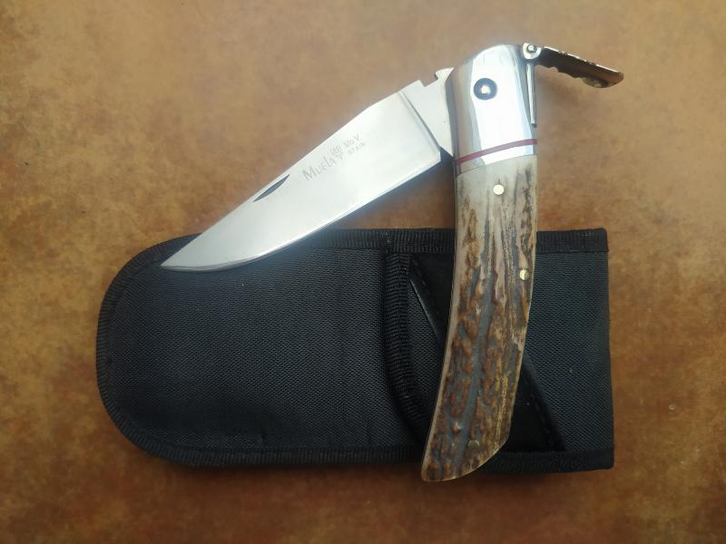 Vendo navaja Muela artesanal modelo NPQ-8A, con cachas de ciervo y lomo decorado.