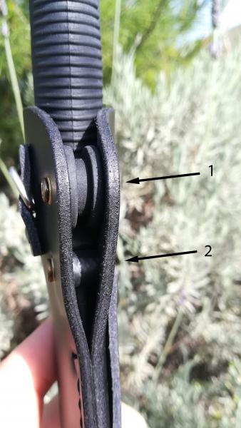 El sistema de retención es doble. El número 1 corresponde a un rodillo que lo retiene impidiendo que se escape hacia arriba y se salga de la funda. El número 2 es un tope que impide que el cuchillo baje y se clave en la funda atravesándola. La funda también lleva un recubrimiento plástico por dentro.