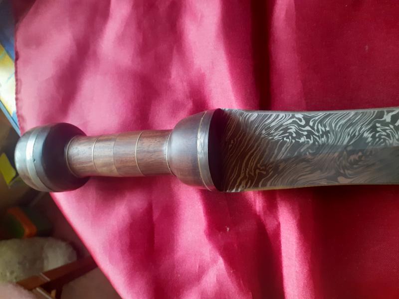 La hoja mide 55,5 cm de largo, 50 mm en el punto mas ancho y 40 mm en el mas estrecho. La empuñadura, de madera mide 12,5 cm de largo. Longitud total : 71,5 cm. La funda es de cuero. El patrón de damasco es precioso.