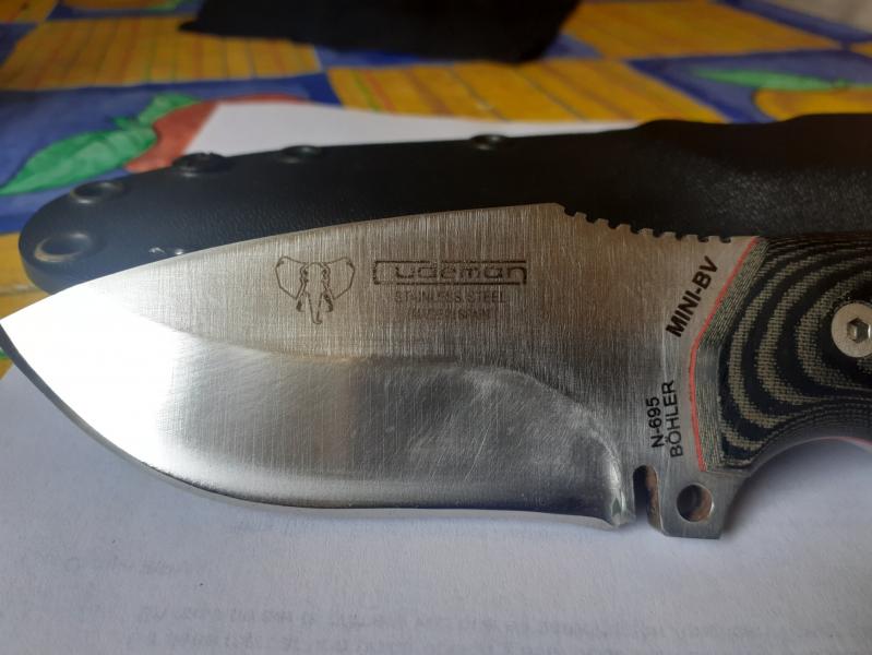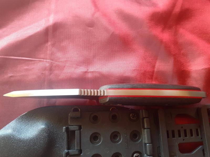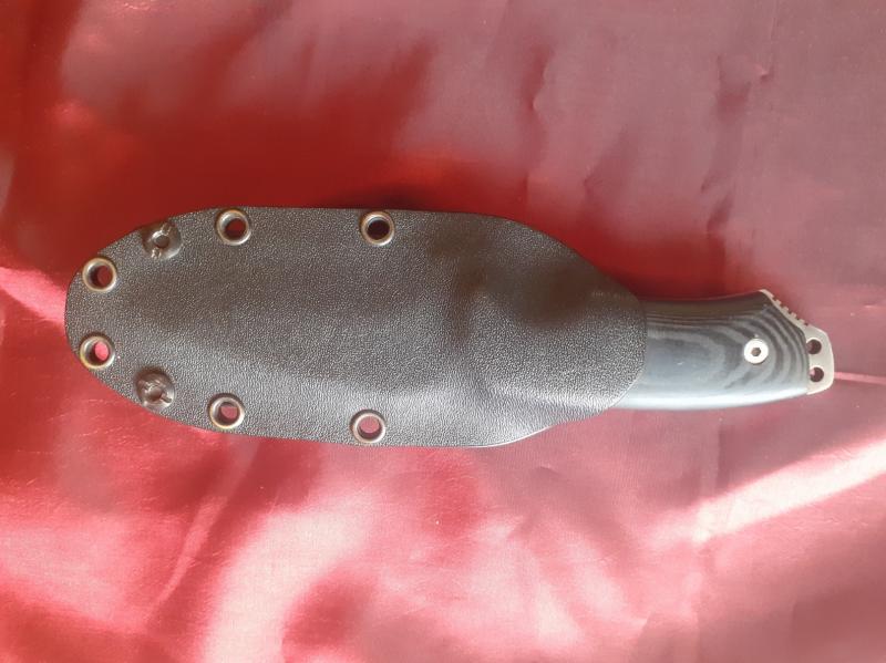 Micarta negra con separadores rojos. Aunque el cuchillo no se ha usado le repasé el filo por entretenerme con el sistema de afilado Lanski. Ahora se puede afeitar con el. Los roces que se aprecian en la hoja son de entrar y salir de la funda.