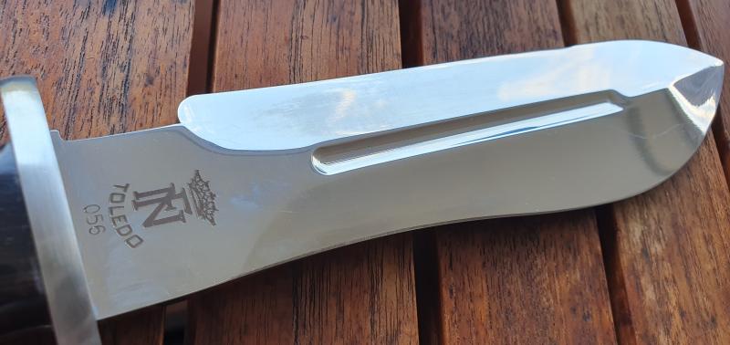 Cuchillo fabricado en 1991 en Toledo, además de ir grabado al ácido con el escudo de la Fábrica Nacional de Toledo (FNT) en el recazo de la hoja y está numerado.