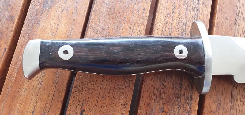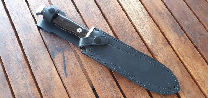 La empuñadura es en madera con dos tormilos como en el oficial, con funda de cuero negra.