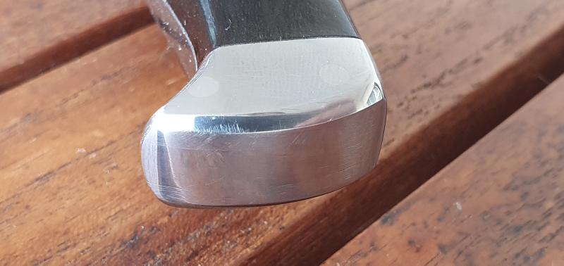 La hoja vista mide 200 mm, el largo total del cuchillo es de 330 mm, tiene 6 mm de grosor y un peso de 388 grms.