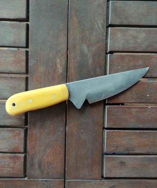 Hoja de acero 80crv2 con tratamiento anticorrosivo. Cachas de micarta amarilla y separadores de cartón vulcanizado. Pasadores de latón. Pasador tubular para fiador. Funda incluida.