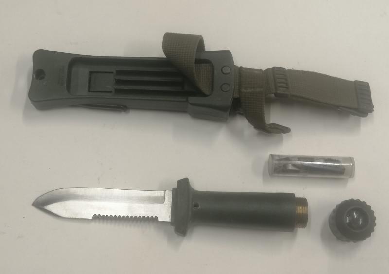 Una pieza icónica del coleccionismo de AITOR, el benjamín de los cuchillos de supervivencia de esta casa. Se encuentra usado, pero en excelente estado, lo único que le falta es la goma del tirachinas que se pudrió por el tiempo transcurrido y lleva hasta el kit de supervivencia de dentro de la empuñadura. Pido 50 euros, rebajado a 45 euros se encuentra en Madrid y puedo enviar por NÁCEX 7 euros. Whatsapp 669403324. VENDIDO