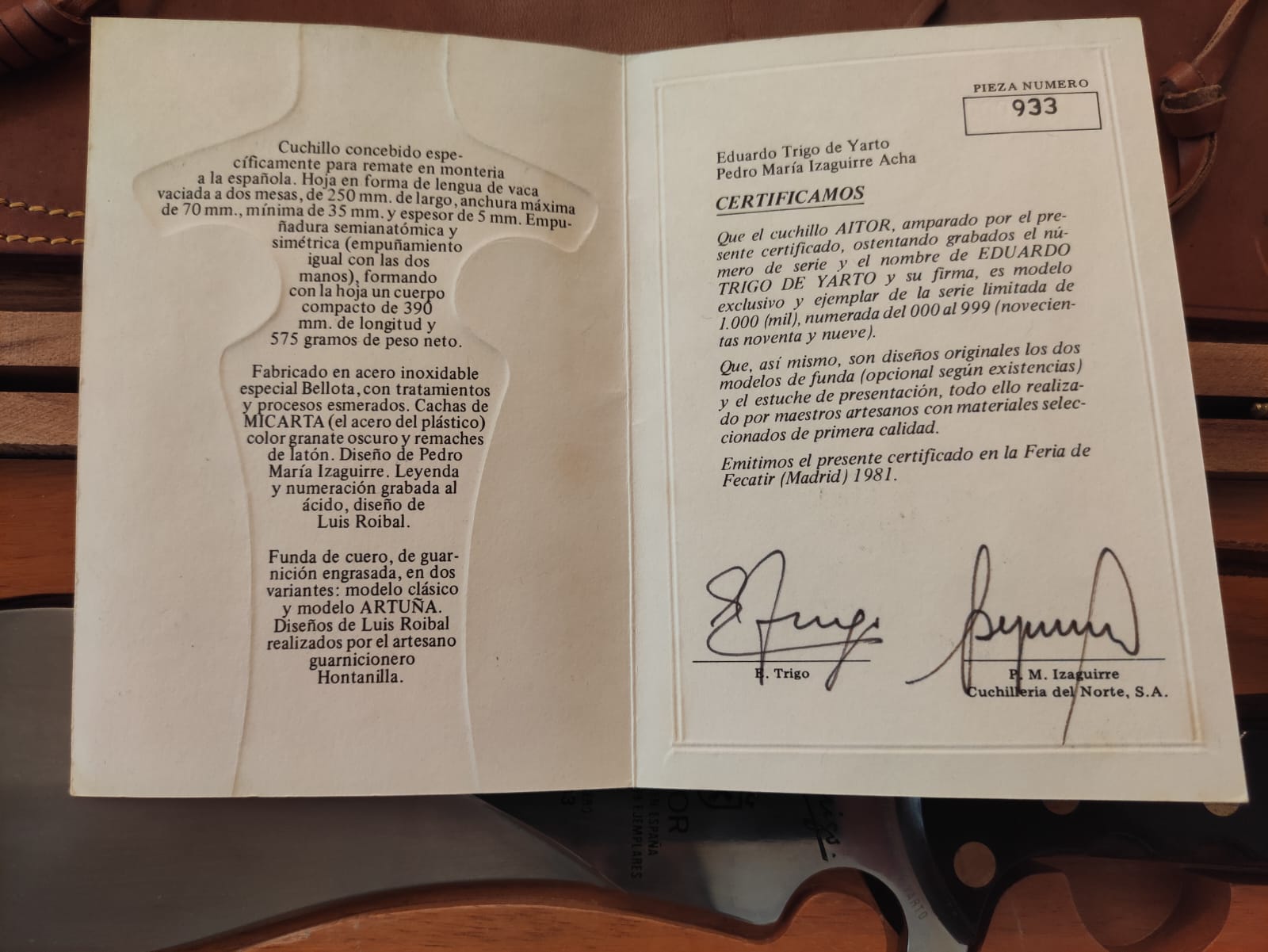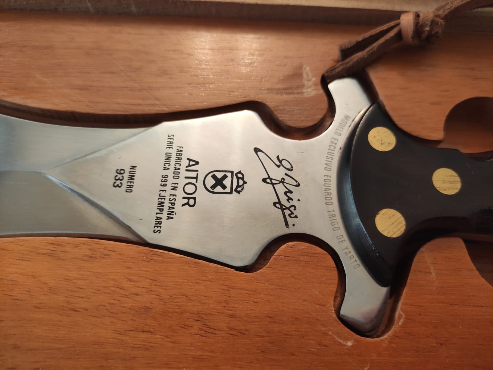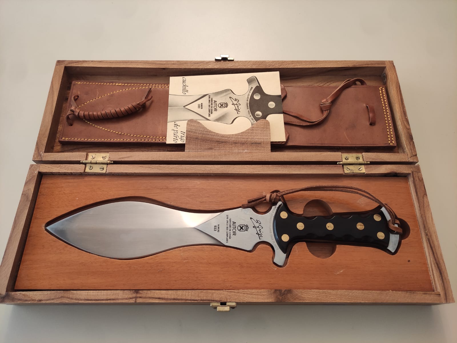 Cuchillo nuevo sin uso de la marca Aitor de los años 80 modelo Eduardo Trigo de Yarto. Cuchillo concebido especialmente para remate en monteria a la española. Hoja en forma de lengua de vaca vaciada a dos mesas de 250mm de largo y una anchura máxima de 70mm. mínima de 35 mm. y grosor de 5mm. Empuñadura semianatómica y simétrica Mide 39 cms de largo y pesa 575 grs.